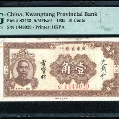 Et lokalt banknot fra Canton Municipal Bank i Kinesisk Guangdong-provins, republikken år 22 (1933), 10 cent, Pick S-2276b, trykt af W&S, certificeret PMG Choice About Uncirculated 58 (certifikatnr. 06-30085), meget sjælden i denne stand. Klik på den blå "gå til varen" knap, for at købe eller byde på denne vare. Den samlede pris vil blive vist inden du afgiver dit bud.