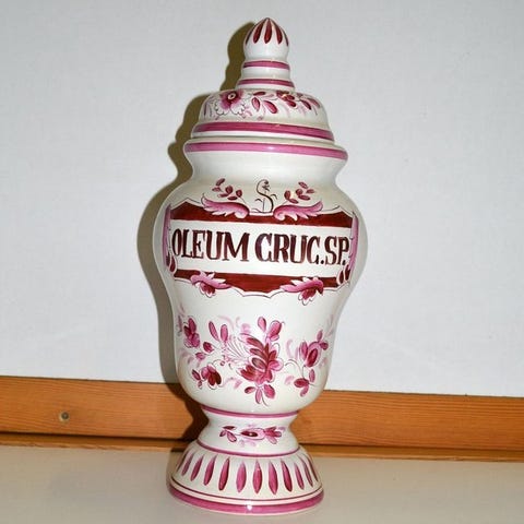 Fransk faience apotekspotte i næsten ny tilstand, fra 1970–1980, diameter 14 cm, dybde 14 cm, bredde 14 cm, højde 25 cm, vægt 895 g, med blomstermotiv og underskrevet 25 cm, komplet med låget. Klik på den blå "gå til varen" knap, for at købe eller byde på denne vare. Den samlede pris vil blive vist inden du afgiver dit bud.
