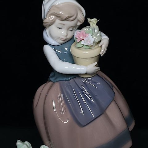 Lladró 2229 porcelænsfigur, håndlavet i Spanien af José Poche i 1992, 'Regali stagionali' ('Seasonal Gifts'), af en ung kvinde med en kurv frugt og grøntsager, i fremragende stand, dimensioner 43 x 22 x 15 cm, usigneret. Klik på den blå "gå til varen" knap, for at købe eller byde på denne vare. Den samlede pris vil blive vist inden du afgiver dit bud.