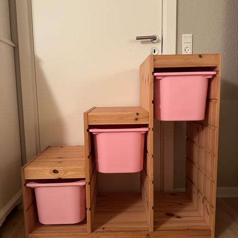 En nem og simpel løsning på opbevaring til ungernes legetøj. To fine reoler. Du bestemmer selv, hvordan de skal vendes, og skinnerne er lette at flytte på med kun en enkelt skrue i hver.