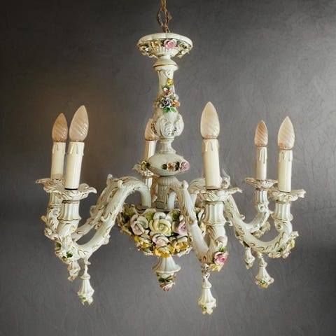 Elegant porcelæns-kronelygte – 4 flammer – fremhævede blomsterdekoration – Europa, det 20. århundrede