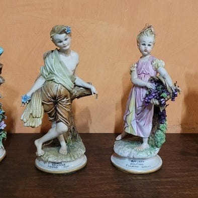 Jeg præsenterer jer dette storslåede og sjældne par porcelænsfigurer fra en privat samling, fremstillet af Capodimonte Porcelænsfabrik (Napoli). Disse skulpturer er ikke kun dekorative genstande, men også genstande fra italiensk kultur.