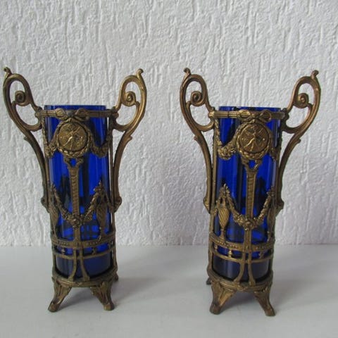 Et par koboltblå porcelænsvaser i bronze og stentøj, Regency/Empire-stil, hver 50 cm høj, 25 cm bred og 15 cm dyb, oprindelse Asien, dateret 2000–2010. Klik på den blå "gå til varen" knap, for at købe eller byde på denne vare. Den samlede pris vil blive vist inden du afgiver dit bud.