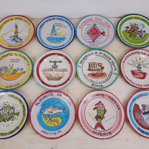 Spectakulært sæt på 12 forskellige tallerkener, der vækker gode minder om italiensk mad.