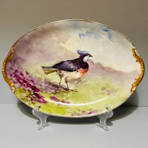 En fajanceplade fra den prestigefyldte Faïenceries et Emaux de Longwy, Frankrig. Dette enestående stykke repræsenterer toppen af den franske keramikkunst fra midten af århundredet, hvor traditionel cloisonné-glasering kombineres med luksuriøse gulddetaljer. Mønstret 'Plaisir' med omfattende gulddararbejde var reserveret til Longwys mest prestigefyldte produktionslinje, beregnet til velhavende samlere og luksuriøse interiører.