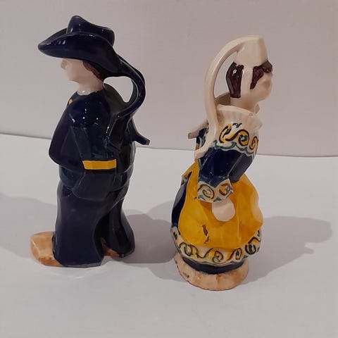 En keramikskulptur med titlen “Quiberon klederdracht” fra Frankrig, der forestiller et ældre par i traditionel Quiberon-kuldræt, underskrevet og i god stand, måler 22 cm i bredde, 31 cm i højde og 12 cm i dybde, i antique stil med nogle få brugsspor og et lille chip. Klik på den blå "gå til varen" knap, for at købe eller byde på denne vare. Den samlede pris vil blive vist inden du afgiver dit bud.