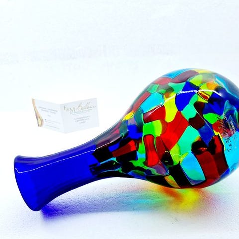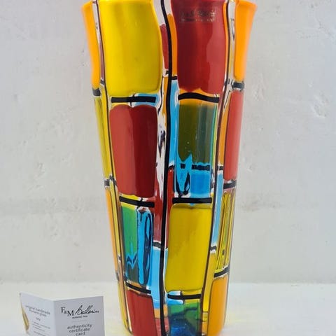 Ny, limited udgave glasvase af designer F&M Ballarin fra Murano, Italien, i designtilstand, højde 21,5 cm, bredde 13 cm, dybde 9 cm, med autencitetscertifikat. Klik på den blå "gå til varen" knap, for at købe eller byde på denne vare. Den samlede pris vil blive vist inden du afgiver dit bud.
