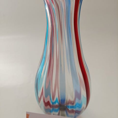 Oplagt en begrænset udgave af en vase håndlavet af designer og mester glasblæser A. Ballarin i Murano (Venedig). Denne nye og smukke vase er lavet i en begrænset serie efter mål og leveres med et autenticitetskort. Vasen er udført i en komplementær/primær farvekontrast med det smukke antracit og transparente linjespil. Personligt synes jeg, det er et af Ballarins smukkeste designs.