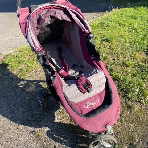 Baby Jogger klapvogn i blå farve. Udstyret med tre hjul og en solskærm med gennemsigtige vinduer. Designet til udendørs brug med fokus på mobilitet og komfort.