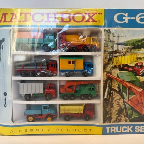 Matchbox Gift Set 6 i farvet zinkbundet metal, inklusive Mercedes Unimog, Pipe Truck, Site Hit Truck, Grit-Spreading Truck, Mercedes Truck, Foden Concrete Truck, 8 Wheel Crane og GMC Tire Truck, mere end 50 år gammel, brugt og i originalemballage. Klik på den blå "gå til varen" knap, for at købe eller byde på denne vare. Den samlede pris vil blive vist inden du afgiver dit bud.