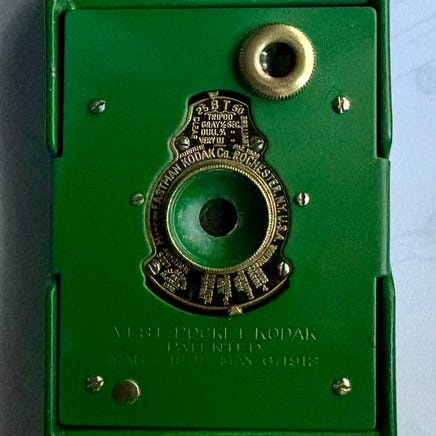 Charmerende grøn Kodak Petite-kamera, et populært model designet i slutningen af 1920'erne. Designet har en farverig art-deco karakter. Den grønne (men også de andre farver) version er eftertragtet blandt samlere af historisk fotografi.