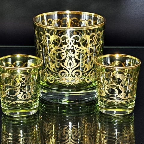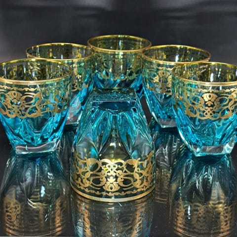 Artemisia seks krystalglas med 24 kt gulddekoration i røggråt, højde 9 cm og diameter 8,5 cm, fremstillet i Italien og i ny stand. Klik på den blå "gå til varen" knap, for at købe eller byde på denne vare. Den samlede pris vil blive vist inden du afgiver dit bud.