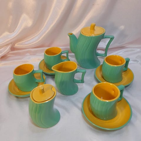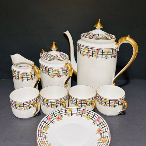 Fire stykker sæt af stentøj med Chinoiserie Nippon-dekor, fremstillet af Societe Ceramique Maastricht, Nederlandene, periode 1910–1920, i udmærket stand, herunder kaffekande 18 cm høj, mælkekande 9 cm høj, skål 13,5 × 7 cm og kagefadet 27 cm i diameter. Klik på den blå "gå til varen" knap, for at købe eller byde på denne vare. Den samlede pris vil blive vist inden du afgiver dit bud.