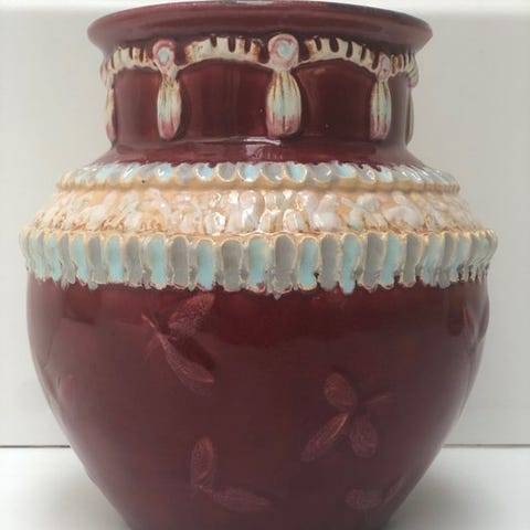 Dette figurative formstykke forestiller en skægget mand, der sidder, iført en rig tunika i orientalsk stil eller en jakke prydet med livlige blomster- eller bladmotiver i nuancer af gult, grønt, orange-brunt rust og blåt på en hvid emaljeret baggrund.
