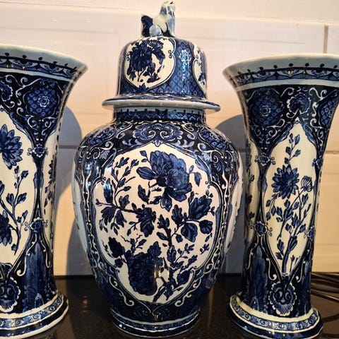 • Dekorationsdetaljer: Den cylindriske base er rigt dekoreret med cirkulære reserver eller cartouches malet i blå camaïeu under glasur, der forestiller scener fra hollandsk landskab, typisk fiskere eller landlige personer, hvilket står i kontrast til den polykrome