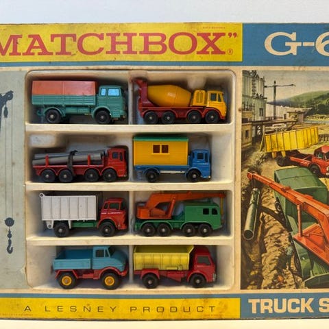 Matchbox Gave Sæt 6, et flerfarvet støbt metal lastbilssæt i originalemballagen, over 50 år gammelt, brugt. Klik på den blå "gå til varen" knap, for at købe eller byde på denne vare. Den samlede pris vil blive vist inden du afgiver dit bud.
