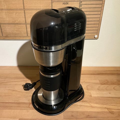 KitchenAid 5KCM0402 One Cup kaffemaskine i sort - fuldstændig ubrugt og i original emballage. Kaffemaskinen er designet til individuel brug og har en kompakt størrelse. Den brygger direkte ned i en termokop, der holder kaffen varm.