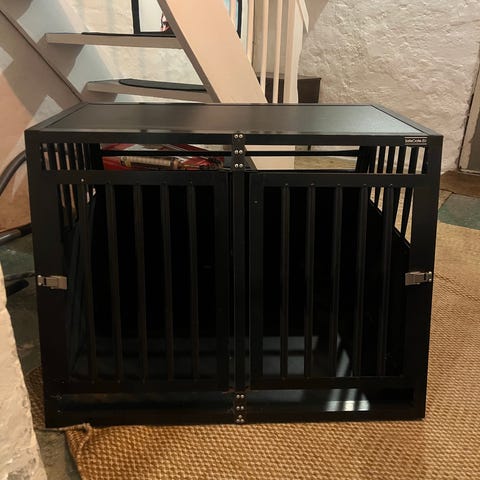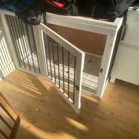 Træ hundebur med gitterdør. Buret er lavet af træ og har en naturlig træfarve. Det er designet til at give en sikker og komfortabel plads til hunde.