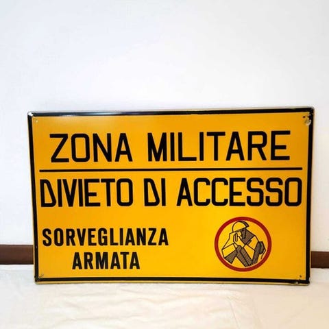 Vintage italiensk vejkilt med teksten 'eccetto residenti', metal, original/officiel, cirka 1980–1990, dimensioner 50 x 25 x 2 cm, vægt 3 kg, brugt tilstand med tydelig slid og sandsynligvis små manglende dele. Klik på den blå "gå til varen" knap, for at købe eller byde på denne vare. Den samlede pris vil blive vist inden du afgiver dit bud.