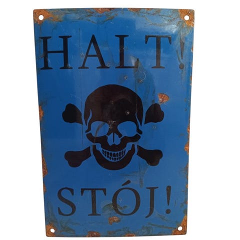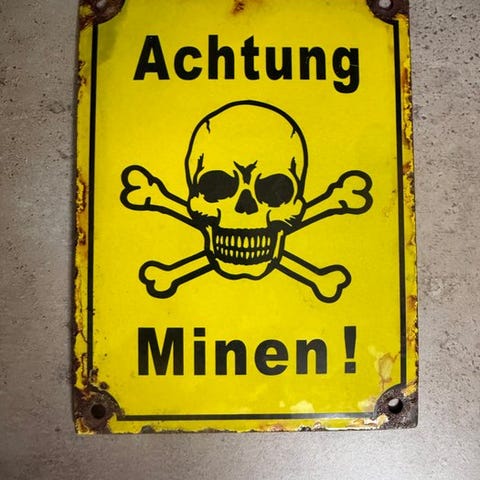 Advarsel: Mine! (Gammel emalje advarselsskilt Ahtung Minen!)