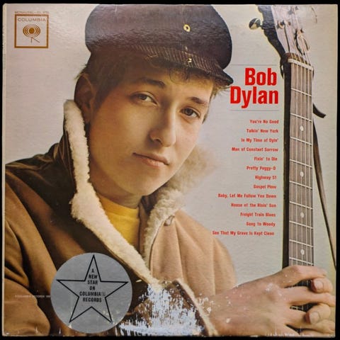 Hvid etiket: "Bob Dylans nye album / Deluxe 2-pladesæt / Med 'Rainy Day Women #12 & 35' og 'I Want You'.
