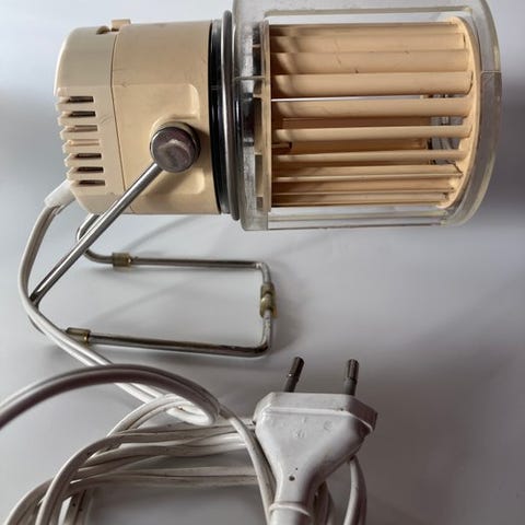ELGE Soupl’air Type VM1S bordventilator af metal, beige med rosa kant på basen, mål cirka 34 cm høj, 25 cm dyb, 20 cm bred, i funktion, dateret 1950–1960, i god brugstilstand. Klik på den blå "gå til varen" knap, for at købe eller byde på denne vare. Den samlede pris vil blive vist inden du afgiver dit bud.