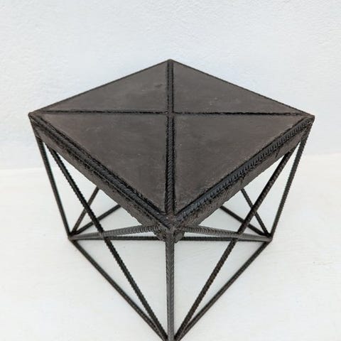 Skulpturelt møbel af beton og stål, i moderne brutalistisk stil, funktionelt kunstværk.