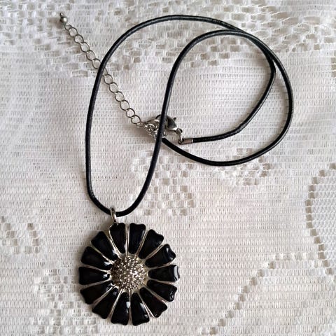 Halskæde af lilla snor med sølvfarvet vedhæng med emalje. Kæden er 43 cm lang, vedhænget er 4 cm langt.