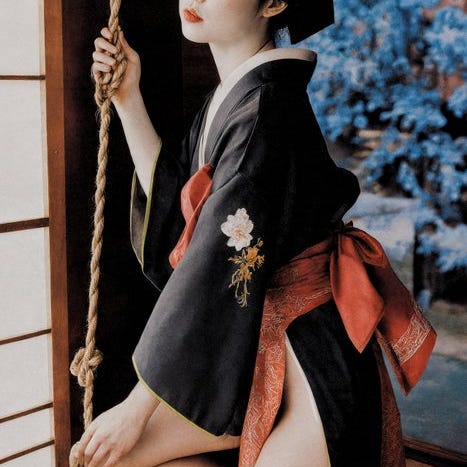 En ensom skikkelse træder frem fra tomheden, prydet i ceremonielt sort og trådet hvidt—hendes blik, uleseligt, forankrer tavsheden. En svag, glødende bevægelse sprækker stilheden, som om ild engang har gennemtrængt hendes skygge. Hendes form, defineret, men stadig opløses, er fanget i et øjeblik af at blive—hverken helt til stede eller fuldstændigt væk. Stoffet, hun bærer, bærer minder som en anden hud: vejret gyldent, obsidian-silke, og ekkoer af forsvundne ritualer.