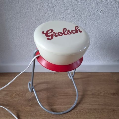 Grolsch Plop dansk designtæppe lampe, fremstillet af metal-plastik, oprindelse Nederlandene, i god brugt stand med mindre ældningsspor, 34,5 cm høj, 25 cm bred, 21 cm dyb, dateret omkring 1990, i funktionsdygtig stand. Klik på den blå "gå til varen" knap, for at købe eller byde på denne vare. Den samlede pris vil blive vist inden du afgiver dit bud.