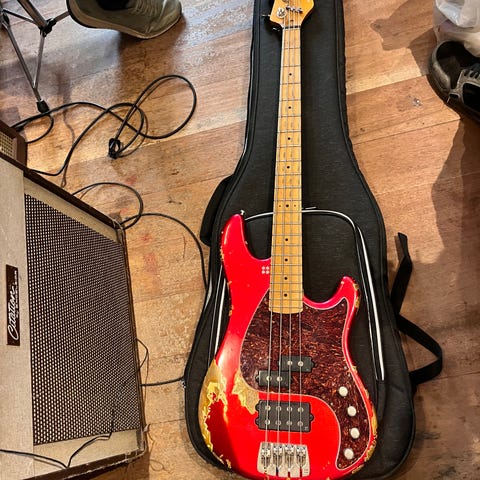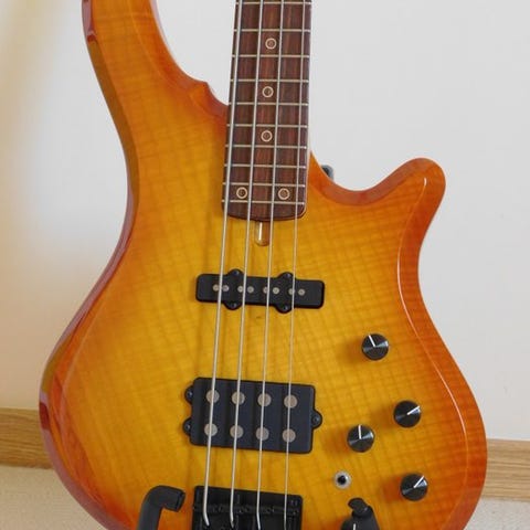 Her er en California VT, specialordre fra en tidligere ejer, som har bedt om den i passiv, selvom VT normalt er aktive. - Fremstillingsår 2010 - Manchet i quartersawn, vurderet ud fra træets åre - bemærk, at bagsiden af manchetten er dækket af en smuk mat lak, der ikke har lidt under aldring (specialordre) - Kulfiberbro og zero fret - Palisander-gribebræt med flot åre. - Moderne radius, ca. 12 tommer ved øjet. - Bredde ved broen 39 mm ifølge mit skydelære. - Krop i alunødvend. - Vægt lidt under 4,2 kg på min køkkenvægt. - Konfiguration PJ med Seymour Duncan spb1+sjb2, meget respektabel udgangsniveau, stor dynamik. Den oprindelige konfiguration var enkel P, J blev tilføjet af