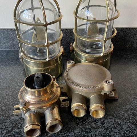 Sæt bestående af fire messing maritime hængelamper med to lamper, kontakt og afbryderkasse; oprindelse Nederlandene; estimeret periode 1990–2000; samlede mål 27 x 14 x 27 cm; kontakt 11 x 11 x 7,5 cm; afbryderkasse 16 x 13 x 6 cm; i god brugt stand med mindre aldersmærker. Klik på den blå "gå til varen" knap, for at købe eller byde på denne vare. Den samlede pris vil blive vist inden du afgiver dit bud.