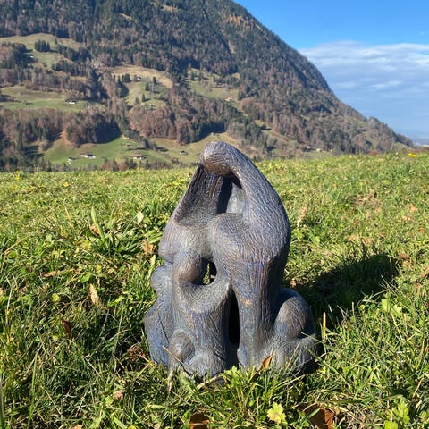 Skulptur i epoxyharpiks med en monokrom patina. Kunstneren fremstillede og podede kobberhalsen, strengene og broen på hver violin.