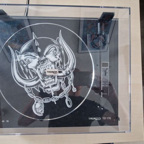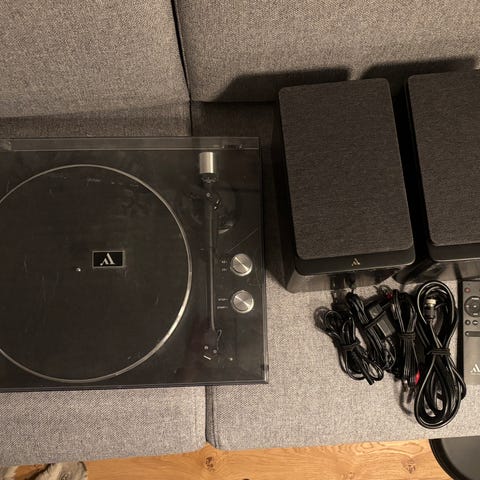 Argon pladespiller med beskyttende støvcover og tilhørende kabler. Enheden er designet til afspilning af vinylplader og inkluderer nødvendige tilslutninger til lydsystemer.