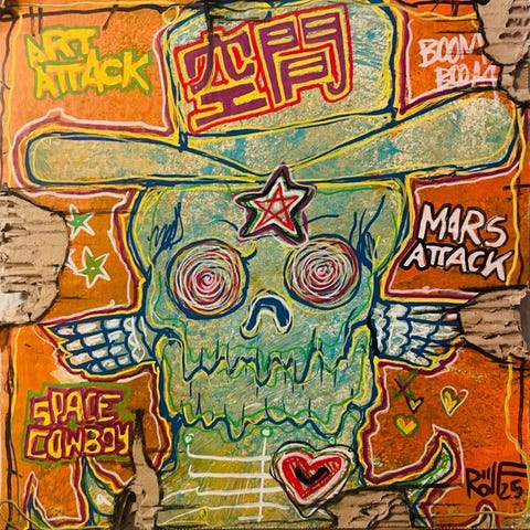 Farverigt originalmaleri af Düsseldorferkunstneren Flör, med titlen „Space Cowboy“. Værket viser en stiliseret kranium med cowboyhat, gennemsyret af dynamiske linjer, symboler (hjerter, pile, kroner) og flere håndskrevne tekststrenge. Baggrunden skifter mellem kraftige farver og forstærker den energifyldte komposition.