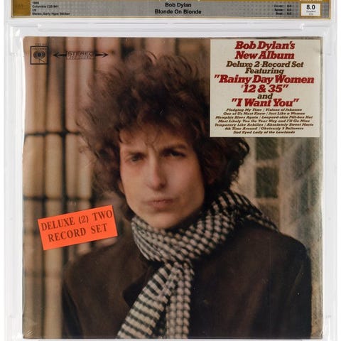 Et ultra-svært, autentisk 1962 US-promoverings førsteudgivelse af Bob Dylans selvbetitlede debutalbum. Denne kopi har de eftertragtede røde 'Six-Eye' Columbia-etiketter med sølvoverprintet 'DEMONSTRATION RECORD NOT FOR SALE'.