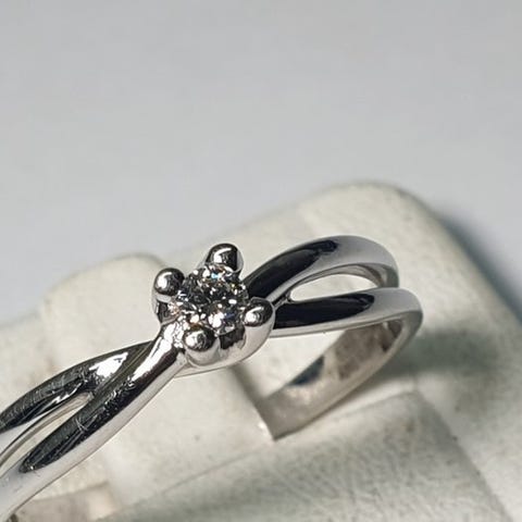 Denne smukke ring er lavet af 3,20 gram 18 kt hvidguld. Den har en brillantskåret diamant på 0,33 ct. Ringen er størrelse 55 EU eller 7 US. Diamantens farve og klarhed er H SI.