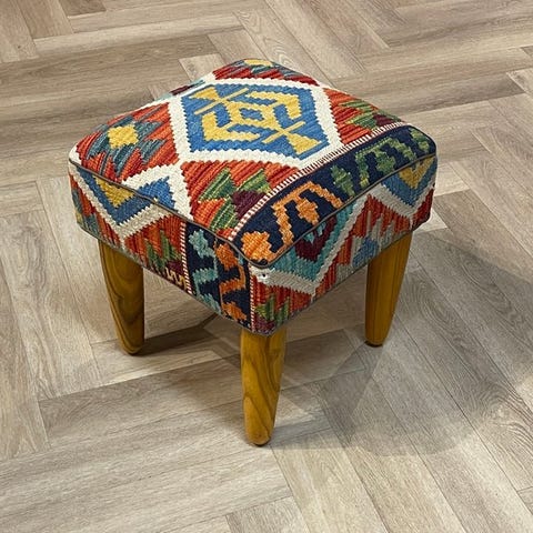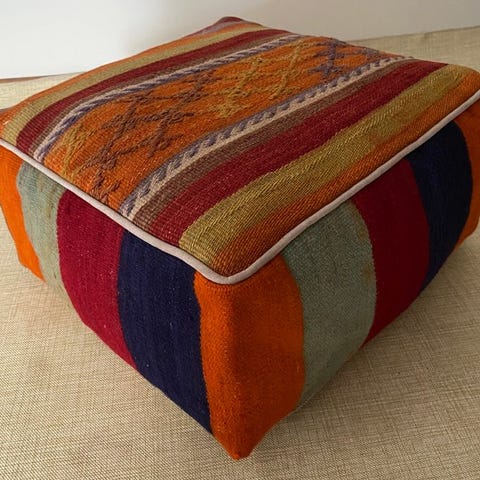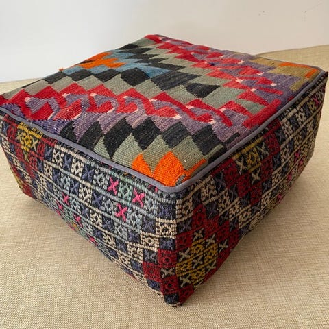 Oprindelsesland Türkiye, model Kelim Poef puf, 48 × 48 × 30 cm, uld på uld, i meget god stand og professionelt renset. Klik på den blå "gå til varen" knap, for at købe eller byde på denne vare. Den samlede pris vil blive vist inden du afgiver dit bud.