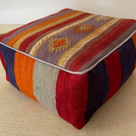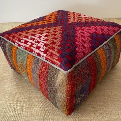 Vores poufs er et vidunderligt dekorativt produkt, som du nemt kan bruge i alle hjørner af dit hjem og din have. Størrelsen på pufene er cirka 48 (bredde) x 48 (længde) x 30 (højde). Vores poufs er lavet af 100% ren uld fra gamle tæpper. Da originale anatolske tæpper bruger naturlige farvestoffer og materialer, er hvert stykke unikt. Forskelle i farver, naturlig slitage, asymmetriske mønstre og linjer kan ses – dette er naturen af gamle tæpper, hvilket gør dem unikke kun for dig. Vores poufs er håndlavede med den højeste kvalitet af syning, så du kan nyde dem i mange år. Det er op til dig at fylde dem, du kan fylde dem med skumstykker, formet skum, uld eller bomuld. De sendes tomme. De vil blive afsendt inden for 3 dage.