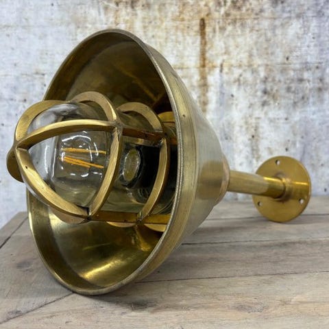 En retro industriel aluminiums væglampe til udendørs og indendørs brug fra EOW. Denne armatur har en prismeformet glas kappe, der blidt spreder lyset, og en beskyttende metalbur.