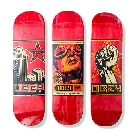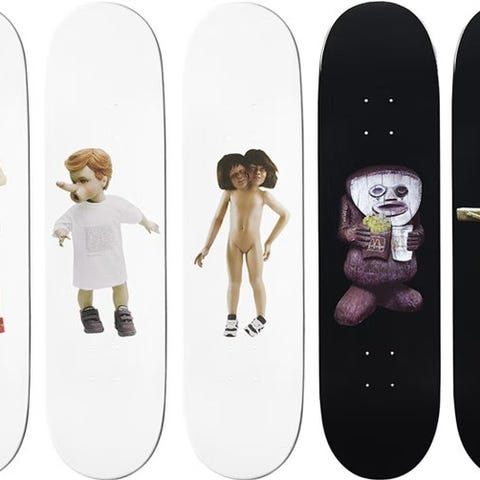 The Trump Skateboard Box Set fra Paul McCarthy indeholder 8 skateboards, såsom Exon Boy - Oil Man - Trump Dump.