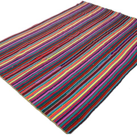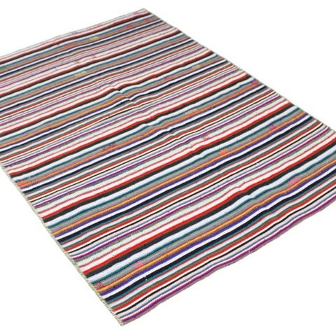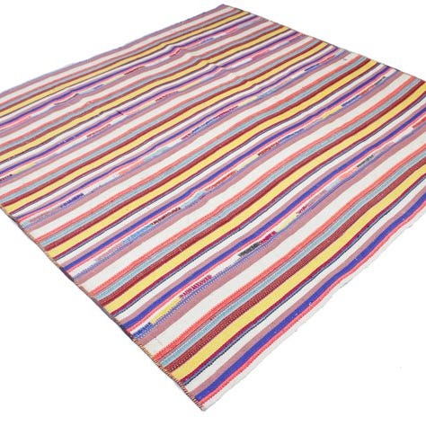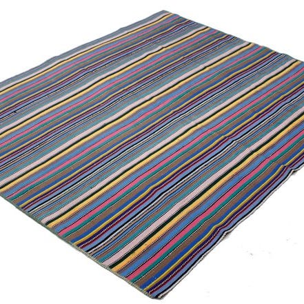 Dette farverige pakistanske Kelim er lavet i traditionelt håndarbejde. Typisk for denne type tæpper er de lyse farver og geometriske stribemønstre, der dannes gennem fladvæv.