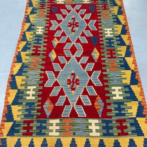 Oprindelsesland: Pakistan; Model: Pakistan Kilim; 1 tæppe i meget god stand, professionelt rengjort; dimensioner 260 cm × 152 cm; materiale uld på bomuld; fremstillet i slutningen af det 20. århundrede. Klik på den blå "gå til varen" knap, for at købe eller byde på denne vare. Den samlede pris vil blive vist inden du afgiver dit bud.