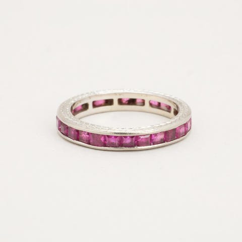 Alliancering i 14K hvidguld med flere lyserøde sten, Str.