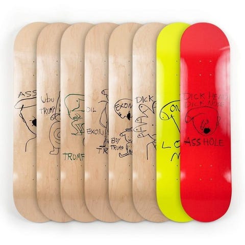 Fire skateboards fra Barry McGee x Baker Skateboards med titlen Theotis – Spanky – Dollin – Reynolds, produceret i 2021 ved hjælp af inkjet-tryk, begrænset udgave, unsigned, oprindelse USA, hver cirka 81,2 × 20,3 cm, i fremragende stand, sælges direkte af kunstneren. Klik på den blå "gå til varen" knap, for at købe eller byde på denne vare. Den samlede pris vil blive vist inden du afgiver dit bud.
