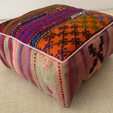Vores poufs er et vidunderligt dekorativt produkt, som du nemt kan bruge i alle hjørner af dit hjem og din have. Størrelsen på pufene er cirka 48 (bredde) x 48 (længde) x 30 (højde). Vores poufs er lavet af 100% ren uld fra gamle tæpper. Da originale anatolske tæpper bruger naturlige farvestoffer og materialer, er hvert stykke unikt. Forskelle i farver, naturlig slitage, asymmetriske mønstre og linjer kan ses – dette er naturen af gamle tæpper, hvilket gør dem unikke kun for dig. Vores poufs er håndlavede med den højeste kvalitet af syning, så du kan nyde dem i mange år. Det er op til dig at fylde dem, du kan fylde dem med skumstykker, formet skum, uld eller bomuld. De sendes tomme. De vil blive afsendt inden for 3 dage. Told, hvis nogen, tilhører køberen.