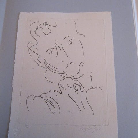 Originaludgaven består af 99 nummererede og underskrevne eksemplarer af Guidi, vores kopi nr. 79, 35 x 50 cm. En litterær del af den franske akademiker og en original aquaforte af Virgilio Guidi, nummereret og underskrevet (34 x 24 cm) med titlen 'La Veronica'. Det skrevne er underskrevet med Guitton's håndskrift. Håndlavet papir fra Fabriano, folio, 8 sider. Fremragende stand.