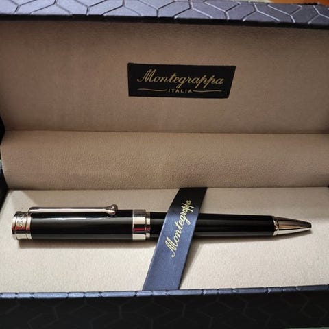 Montegrappa Extra 1930 kuglepen i celluloid med grønlig nuance og massiv 925 sterling sølv, 13,8 cm lang og 1 cm i diameter, lavet i Italien, fra den sene 1900-tals periode, i fremragende stand og fuldt funktionsdygtig, med æske og dokument. Klik på den blå "gå til varen" knap, for at købe eller byde på denne vare. Den samlede pris vil blive vist inden du afgiver dit bud.