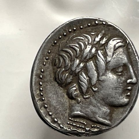 Romersk republik denar af Q. Titius, 90 f.Kr., sølv (AR), vægt 3,87 g, diameter 19 mm, obverse: hoved af Mutinus Titinus (Priapus) til højre med vinget diadem, reverse: Pegasus der hopper til højre med Q TITI på basen; Cr 341/1, Syd 691; Ikke bedømt. Klik på den blå "gå til varen" knap, for at købe eller byde på denne vare. Den samlede pris vil blive vist inden du afgiver dit bud.