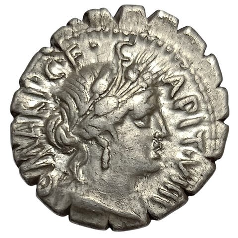 Obverse: Hoved af Mutinus Titinus (Priapus) til højre, iført vingeprydet diadem.
